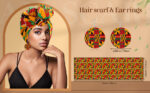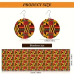 - Drop Dangle Earrings: A pair of round, wooden earrings also featuring the same Kente-inspired print. These earrings tie the entire set together, offering a complete and stylish ensemble.