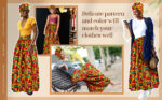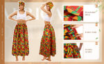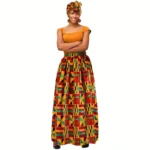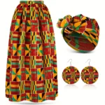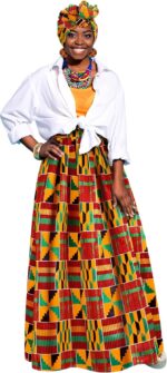- Maxi Skirt: A long, flowing skirt with a high waist, featuring a bold, geometric pattern in red, yellow, green, and black. The pattern is characteristic of Kente cloth, known for its intricate designs and symbolic colors. The skirt also appears to have pockets, adding a practical element to the traditional style.