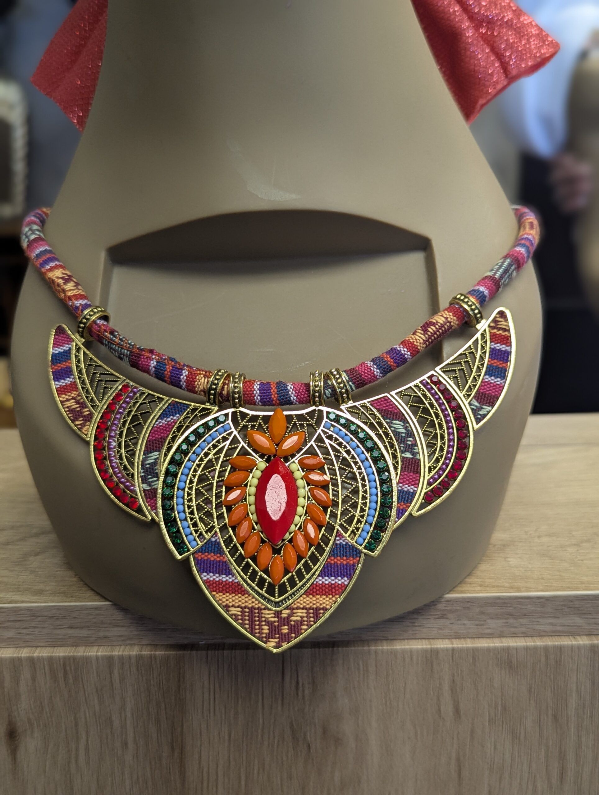 Displayed on a mannequin in a meticulously curated setting, this necklace doesn’t just complete an outfit; it tells a story. It invites you to imagine an inspired styling journey where bold, handcrafted details merge seamlessly with modern sensibilities. How might this intricately designed piece transform your wardrobe narrative?