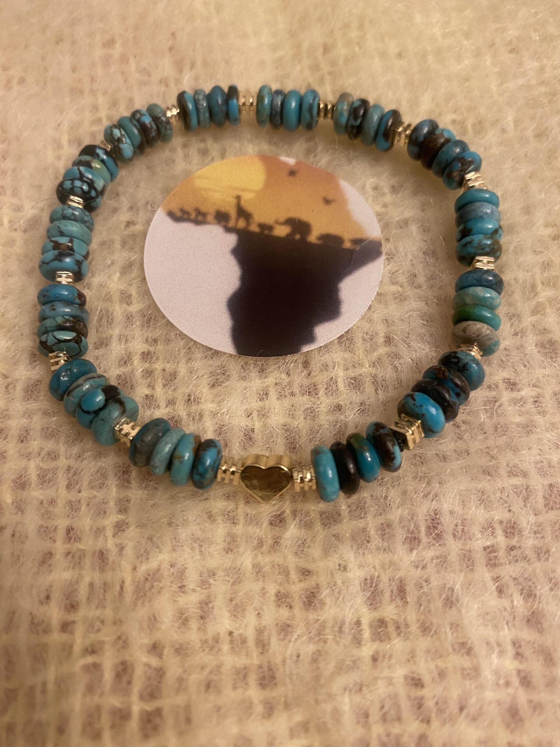 This bracelet is a vibrant expression of natural beauty and thoughtful craftsmanship. Made with turquoise beads featuring intricate black and brown marbling, it brings to mind the serene hues of ocean waves or the depths of a clear summer sky. The beads are elegantly separated by metallic spacers, adding a touch of sophistication to the piece.
