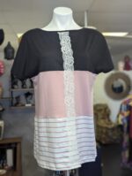 A striking feature is the vertical strip of white lace that runs gracefully from the neckline to the hem. This delicate detail acts as a unifying thread—a subtle architectural element that ties the contrasting color blocks together while adding texture and visual intrigue to the design. It transforms the top from a simple garment into a canvas of artful storytelling, where every color and detail contributes to the narrative of modern elegance blended with a hint of whimsy.