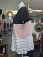 This outfit is a masterful interplay of bold contrast and delicate charm. The top, with its three distinct sections, immediately draws the eye with its dynamic composition: the upper black portion exudes sophistication and an unmistakable edge, setting the stage for what’s to come. The middle section, in a gentle light pink, softens that initial impact, offering a warm transition that whispers of playfulness and refined femininity. Finally, the lower section, rendered in white with light pink horizontal stripes, brings an element of breezy lightness and casual allure.