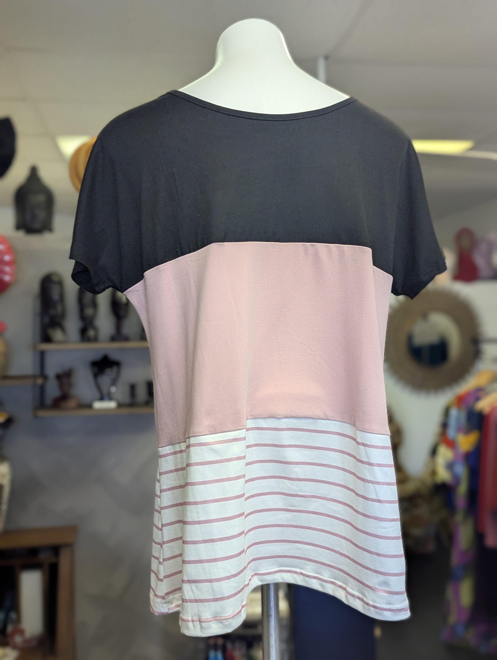 Presented against a boutique backdrop filled with curated decorative objects, this outfit suggests a sense of intentional style. It’s a piece that invites creative styling; imagine pairing it with tailored trousers for a polished look or with casual denim to underscore its playful side. The meticulous color blocking paired with the refined lace detail not only celebrates individuality but also makes this top an ideal centerpiece for those who favor contemporary fashion with an artistic twist.