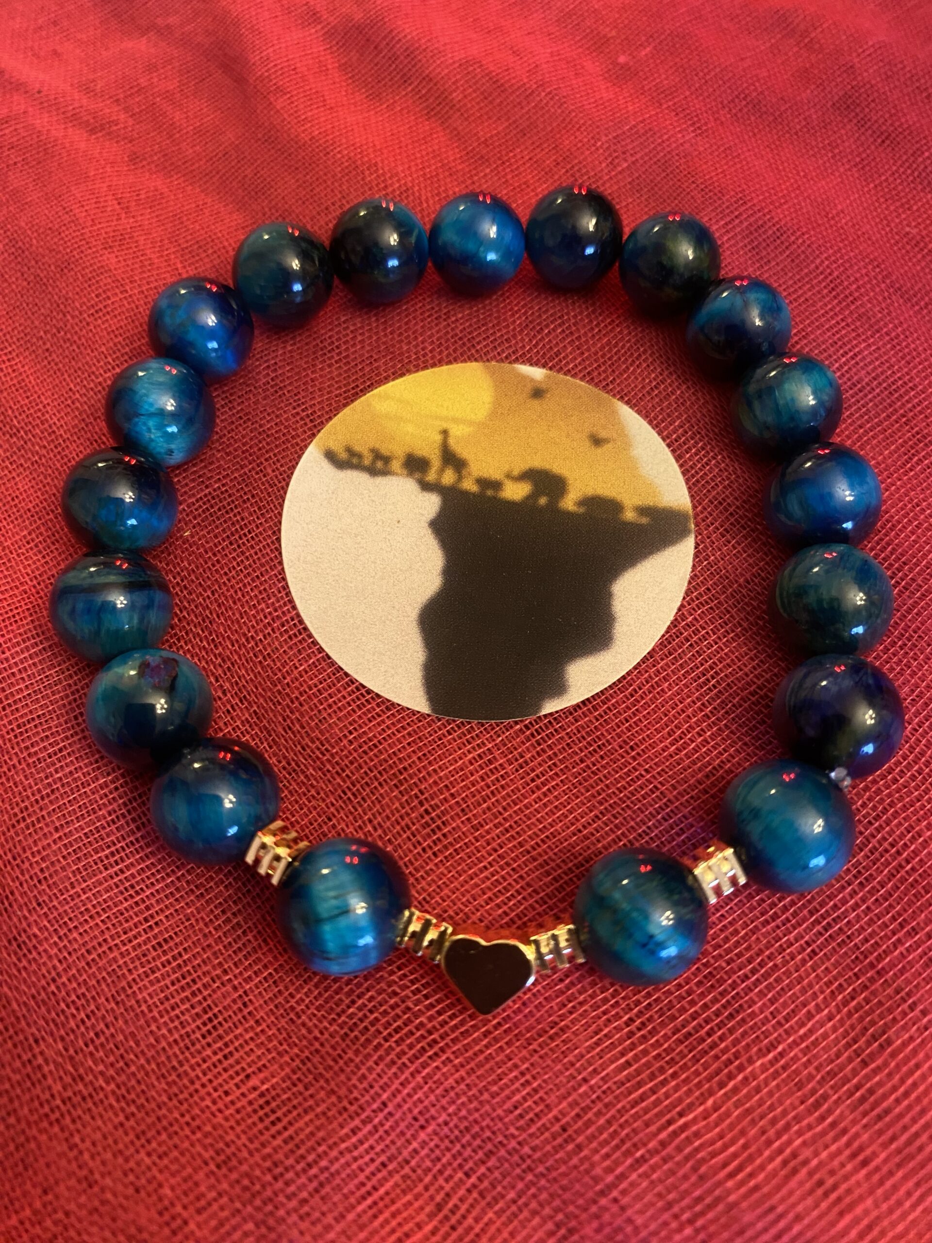 The cool, rich blue hues of the Tiger Eye, combined with the sweet black and gold heart charm and the geometric gold spacers, create a bracelet that is both striking and charming. The chatoyancy of the Blue Tiger Eye gives it a dynamic and eye-catching quality.