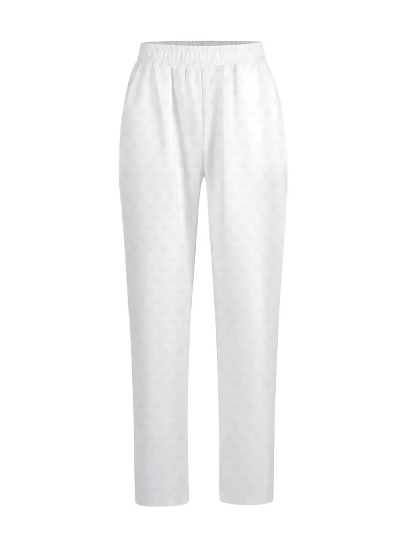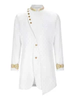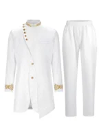 The pristine white fabric, featuring a subtle, self-textured pattern, provides a canvas for stunning details. A bold, asymmetrical cut gives the jacket a distinguished silhouette, while intricate gold embroidery adorns the mandarin collar and cuffs, adding a touch of regal opulence. Complemented by sleek, matching trousers, this suit promises a look that is both commanding and effortlessly comfortable.